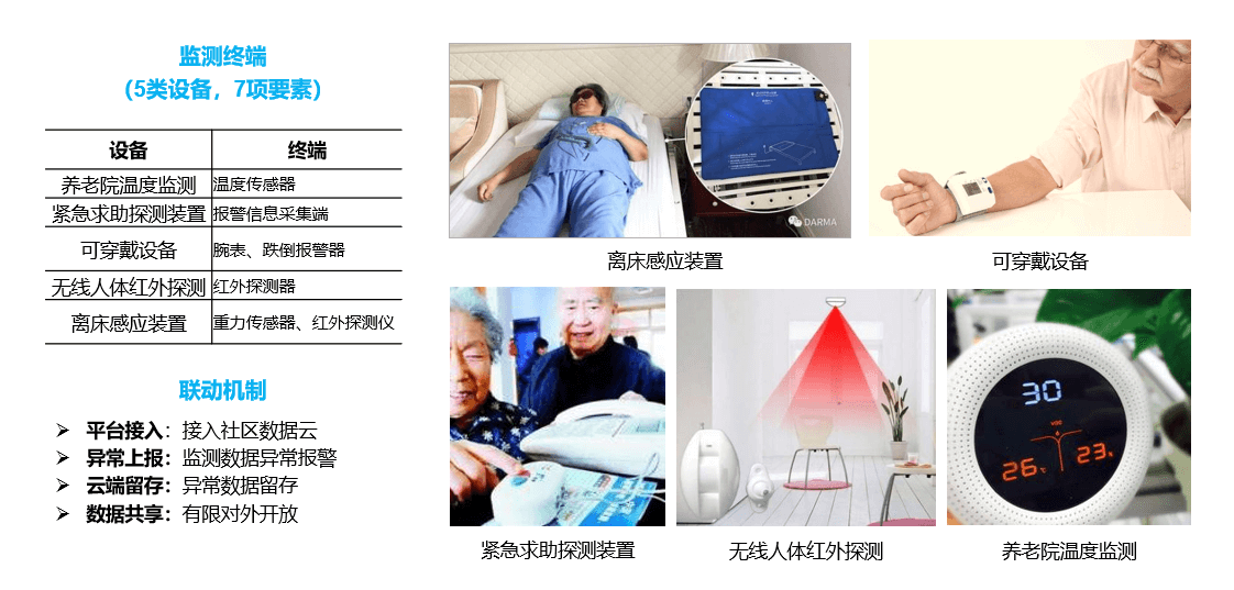 通过安装多种物联网设备,对居家养老或者养老院的环境进行实时监测,活动情况,提供一键呼救和危险报警功能。