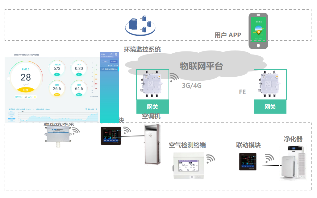 搭配相应的传暗器,实现环境监测数据的采集、传输、存储和分析,同时可以联动部分控制设备进行干预处理。
